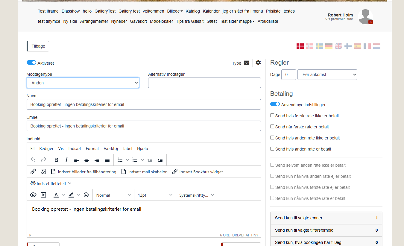 - "Dage (..) Før ankomst/Efter afrejse/Efter ankomst/Før afrejse" - Bruges hvis man ønsker at sende besked, et antal dage før eller efter et ophold. Kunne være "Nu der ikke længe til dit ophold" eller "Ønsker du at udfylde vores spørgeskema?".